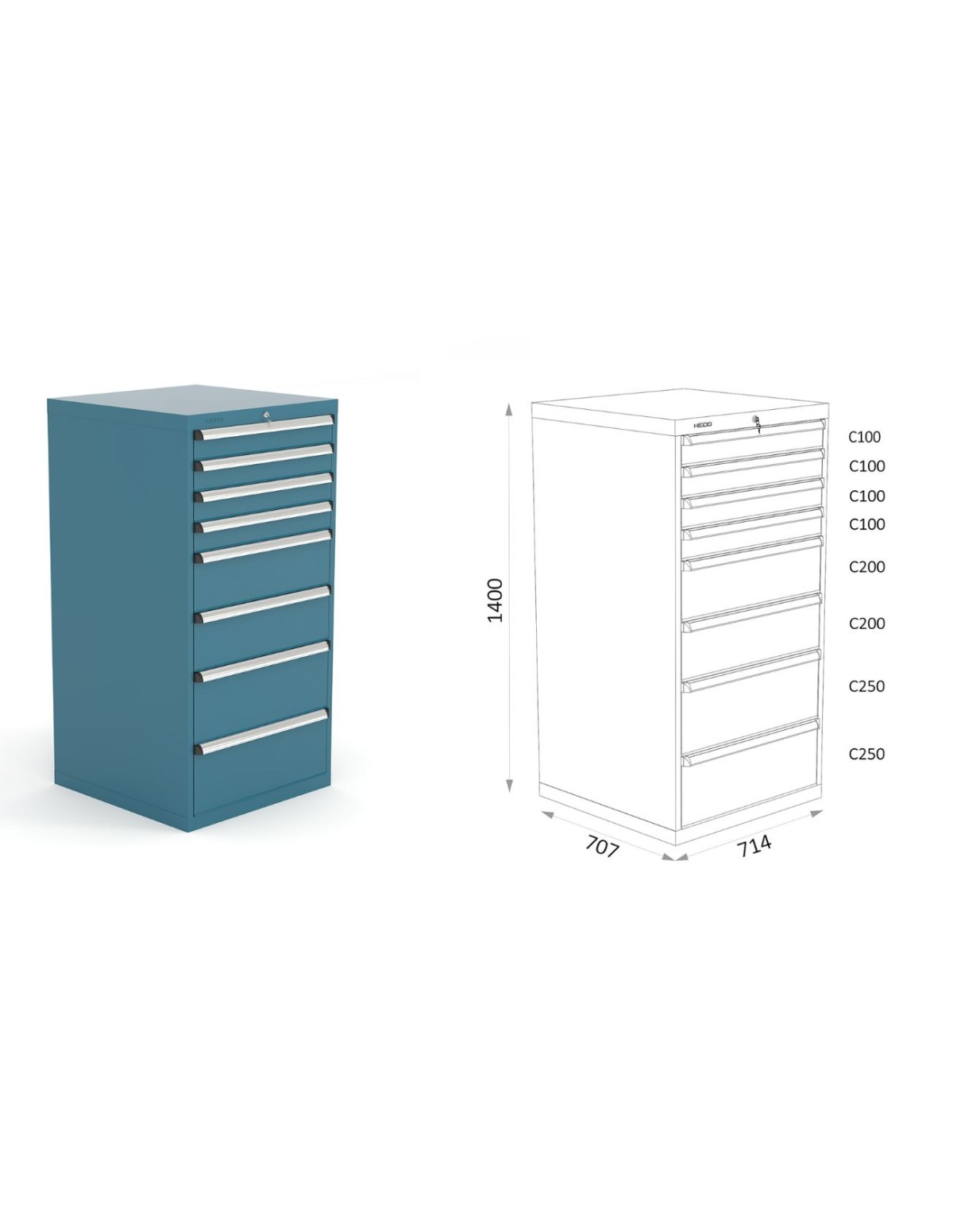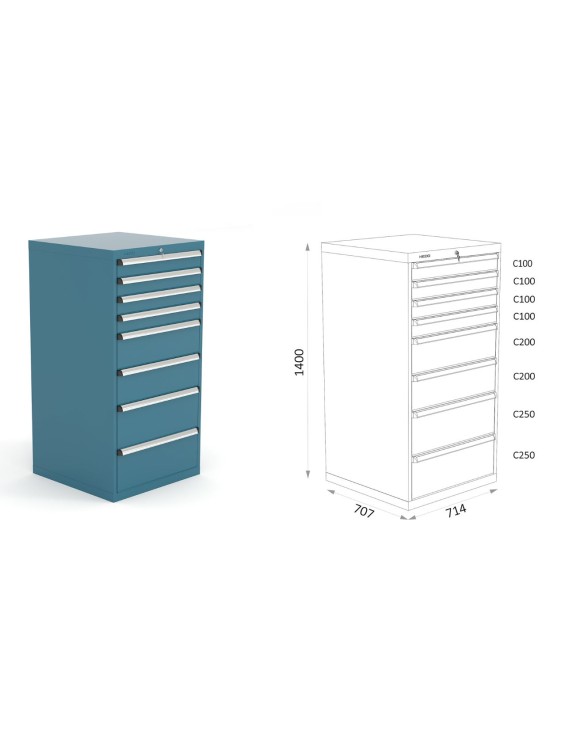Cuerpo en color gris RAL 7035 (posibilidad de otros colores mediante presupuesto). Puertas a elegir: gris RAL 7035 / azul RAL 5010 / rojo (posibilidad de otros colores...