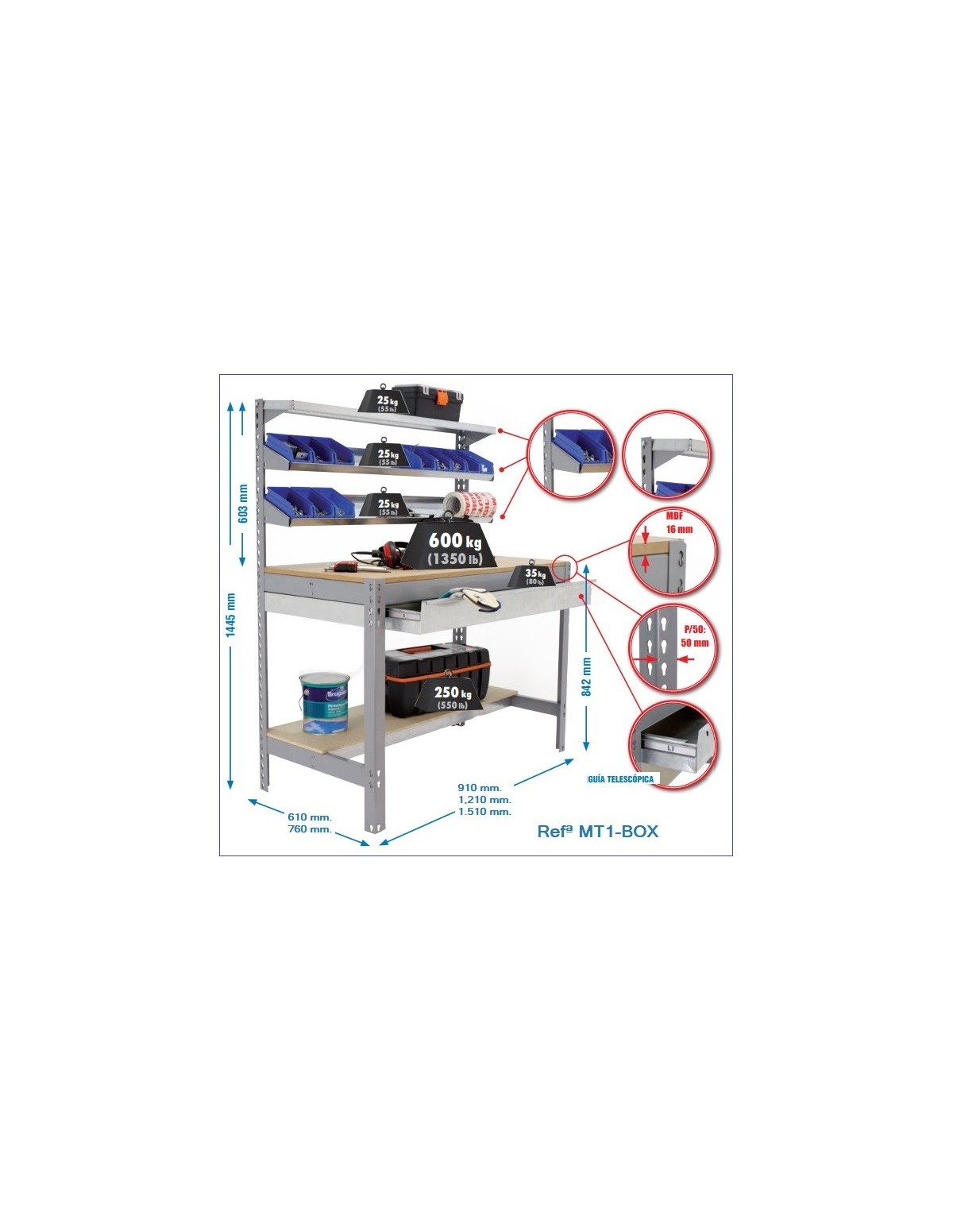 - 600 Kg en bandeja superior con carga uniformemente repartida.