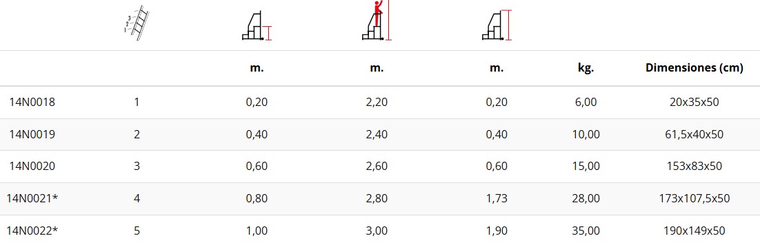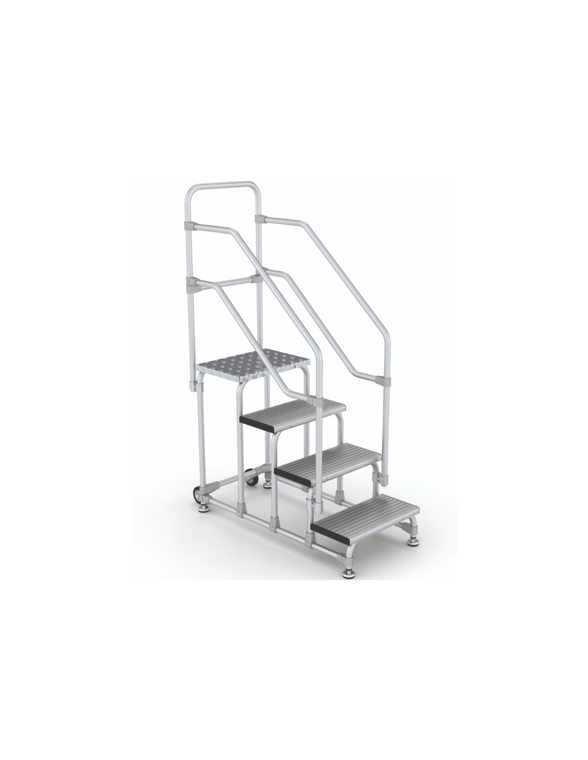 Cuenta con tacos de goma regulables en altura, lo que te permite ajustarlo de acuerdo a tus necesidades. Además, los modelos de 4 y 5 peldaños están equipados con ruedas de Ø100 mm para facilitar su movilidad. Los modelos 4 y 5 incluyen barandillas.