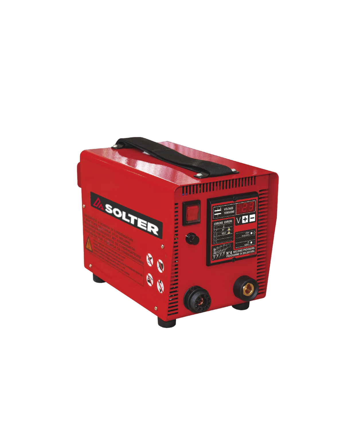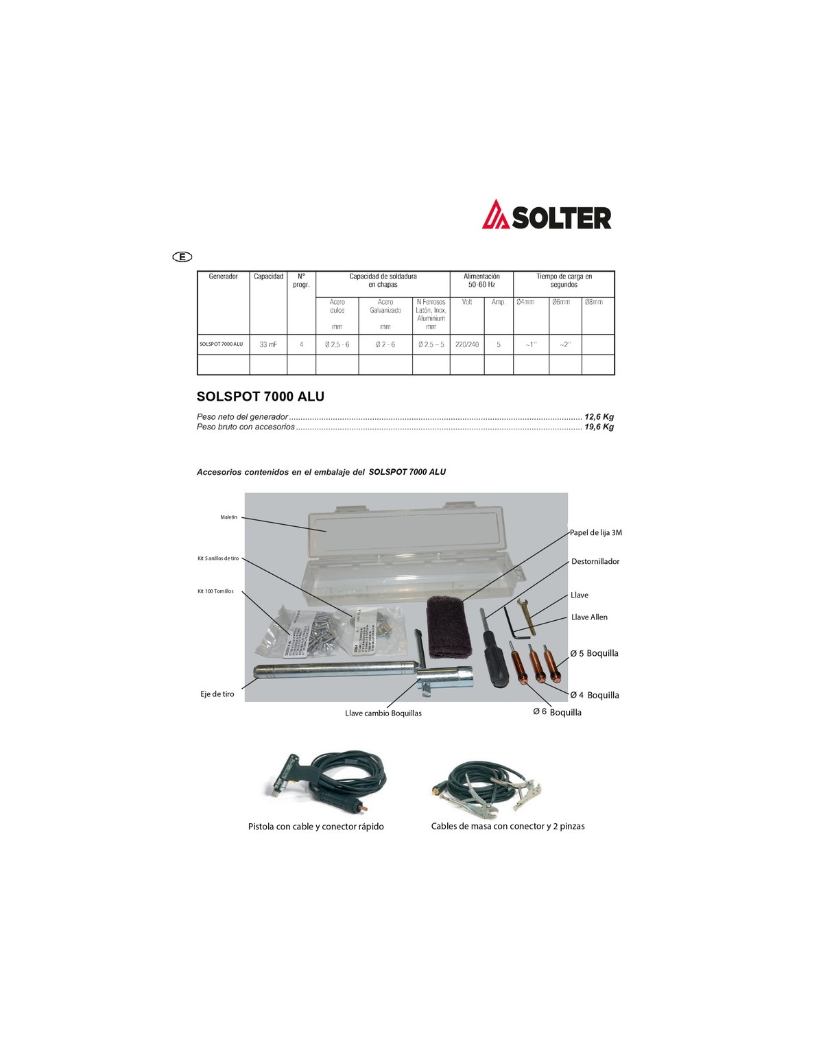 La Solter SOLSPOT 7000 ALU es una máquina especializada para reparación de carrocerías de aluminio mediante tecnología de descarga capacitiva. Emplea un banco de condensadores que libera una descarga de 2–3 milisegundos para soldar pines de aluminio (diámetros de 2 a 6 mm), permitiendo trabajos de extracción de abolladuras precisos y sin deformación térmica en el reverso de la pieza.