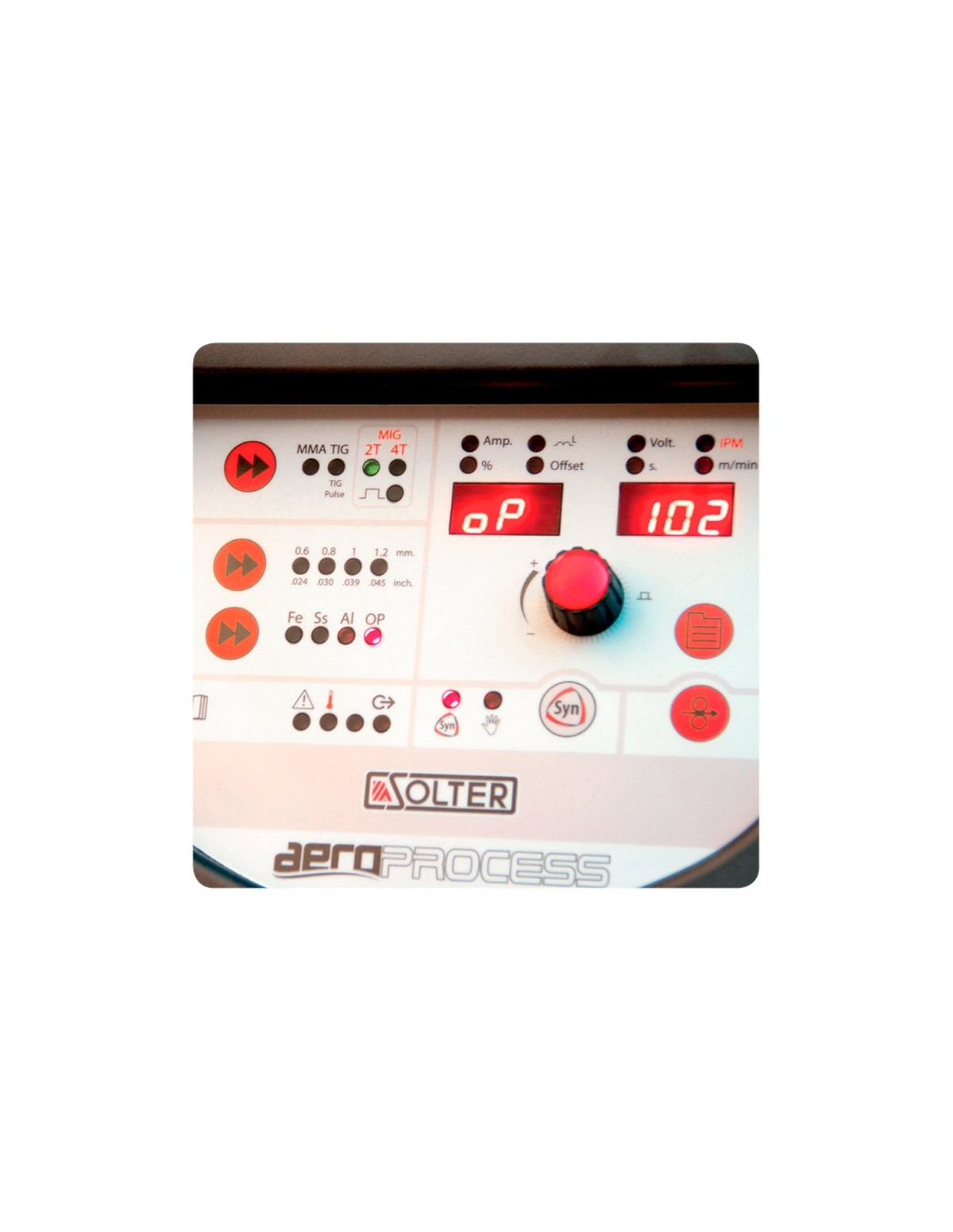 Control sinérgico inteligente: Permite configuraciones automáticas según el tipo de material y proceso, control de altura del arco, funciones Crater Filling, lectura de tensión e intensidad en tiempo real y almacenamiento de hasta 10 programas.