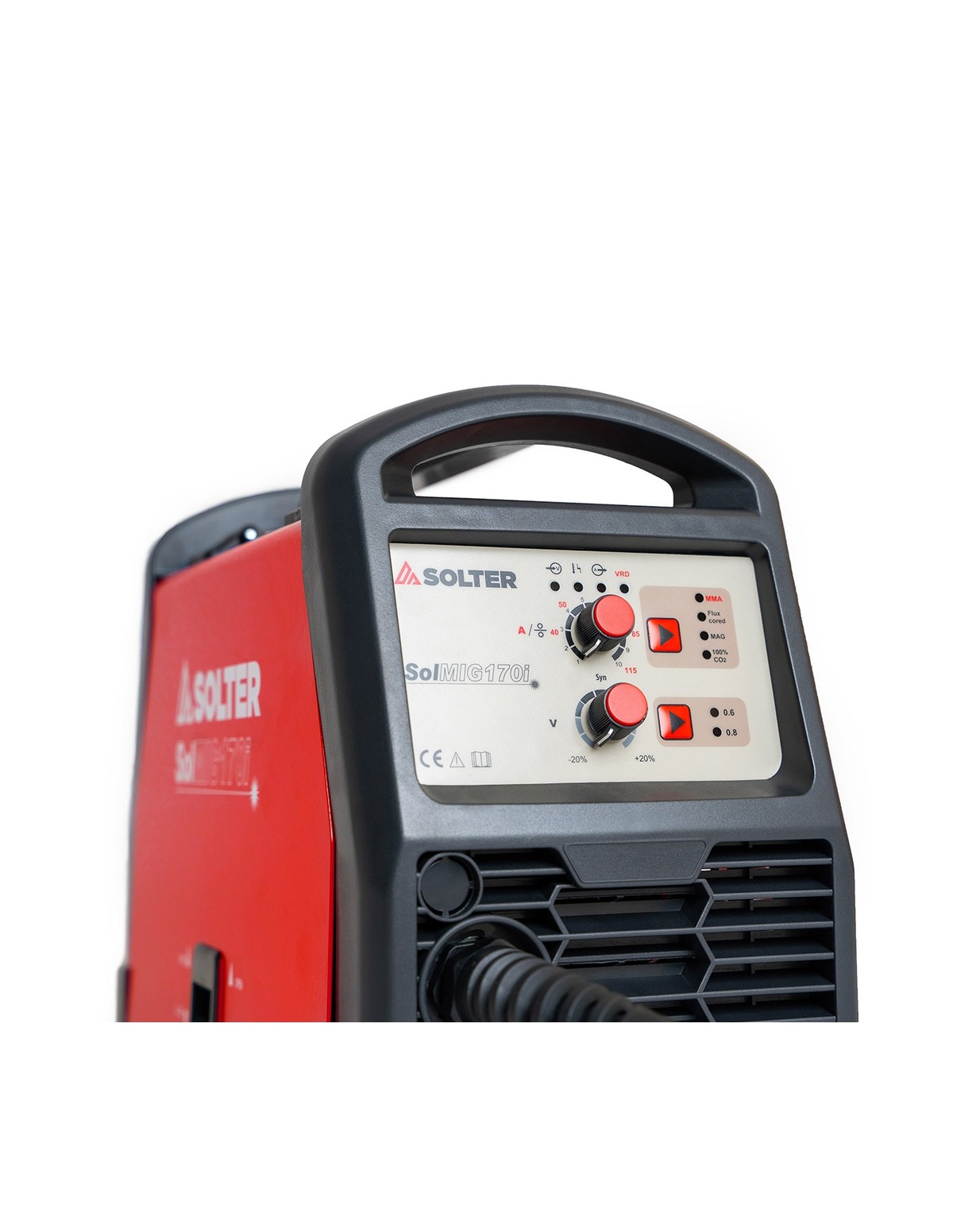 Interfaz digital intuitiva: Panel SOLMIG DIGITAL con perillas de acceso rápido e indicadores LED que permiten ajustar potencia, velocidad de hilo y tipo de proceso de forma sencilla.