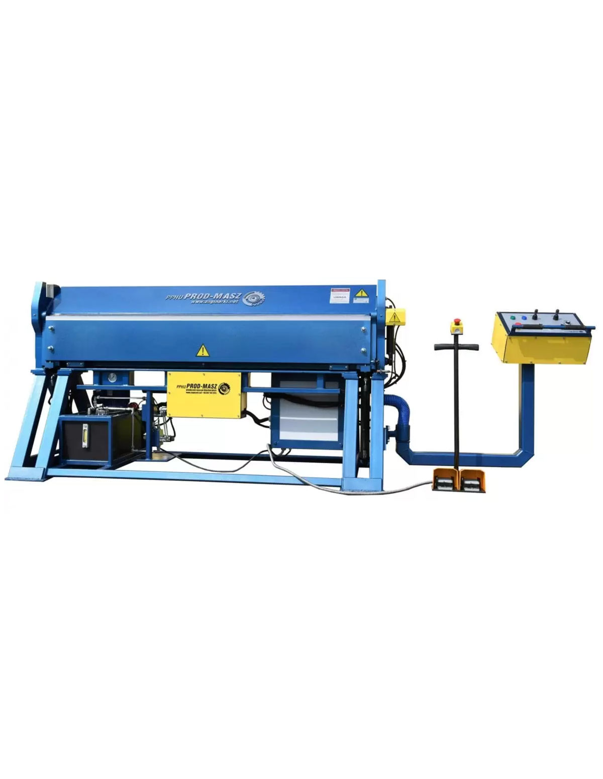 Esta plegadora está equipada con un sistema de sujeción hidráulico y una viga superior motorizada, lo que mejora considerablemente la eficiencia en comparación con equipos manuales. El modelo incluye también topes traseros para facilitar trabajos repetitivos con gran precisión.